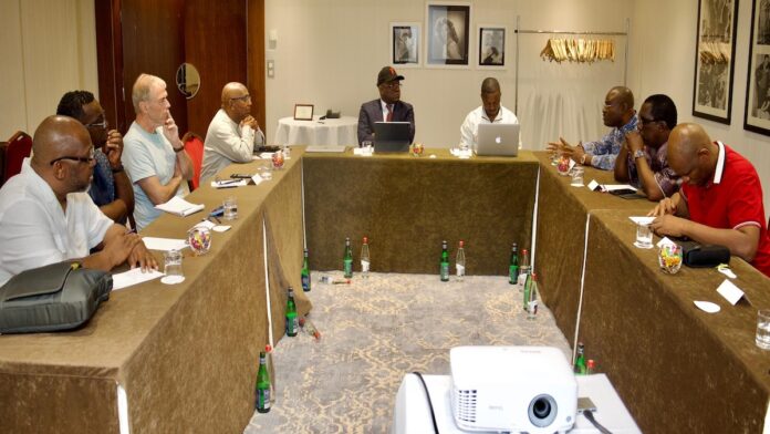 En l’absence du ministre, le directeur national adjoint des sports et des activités physiques, Monsieur Mamadou Aliou Sory Barry, a présidé la réunion qui s’est déroulée en présence du Président de la Fédération Guinéenne de Football, Monsieur Aboubacar Sampil, du Chef du Département Cmpétitions de la FGF, Monsieur Mamadou Yaya Binta Diallo, Chef du Département Compétitions de la FGF et du PDG de Guicopres, Monsieur Kerfalla Camara KPC.
