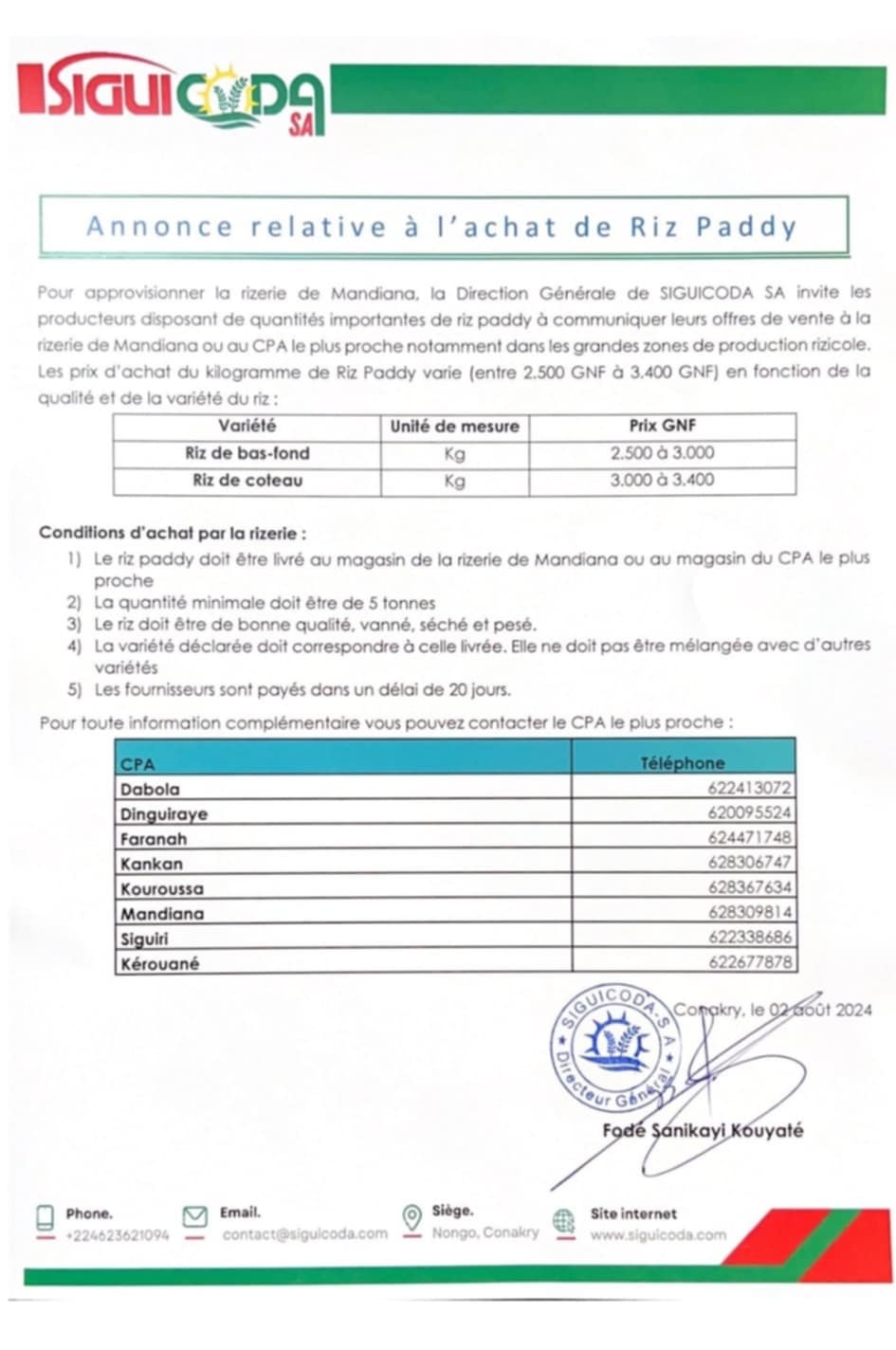 Conakry, 02 août (AGP)-Pour approvisionner la rizière de Mandiana, la Direction Générale de la SIGUICODA SA invite les producteurs disposant de quantités importantes de riz Paddy à communiquer leurs offres de vente à la rizerie de Mandiana ou au CP A le plus proche notamment dans les grandes zones de productions rizicole.