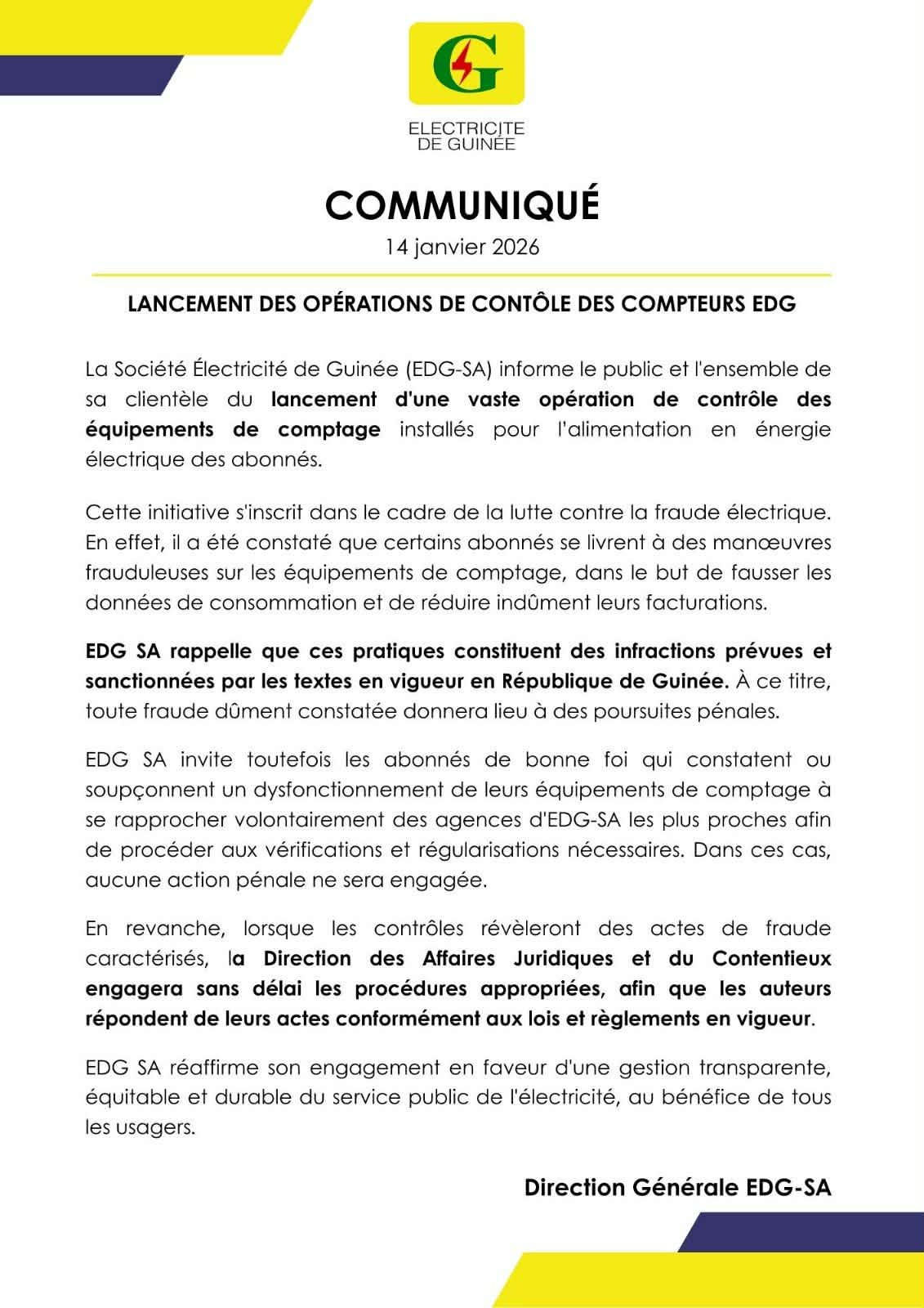 Conakry, 14 jan (AGP)-La société Electricité De Guinée (EDG) informe le public et l’nsemble de sa clientelle du lancement d’une vaste opération de contrôle des équipements de comptage installés pour l’alimentation en énergie électrique des abonnés.