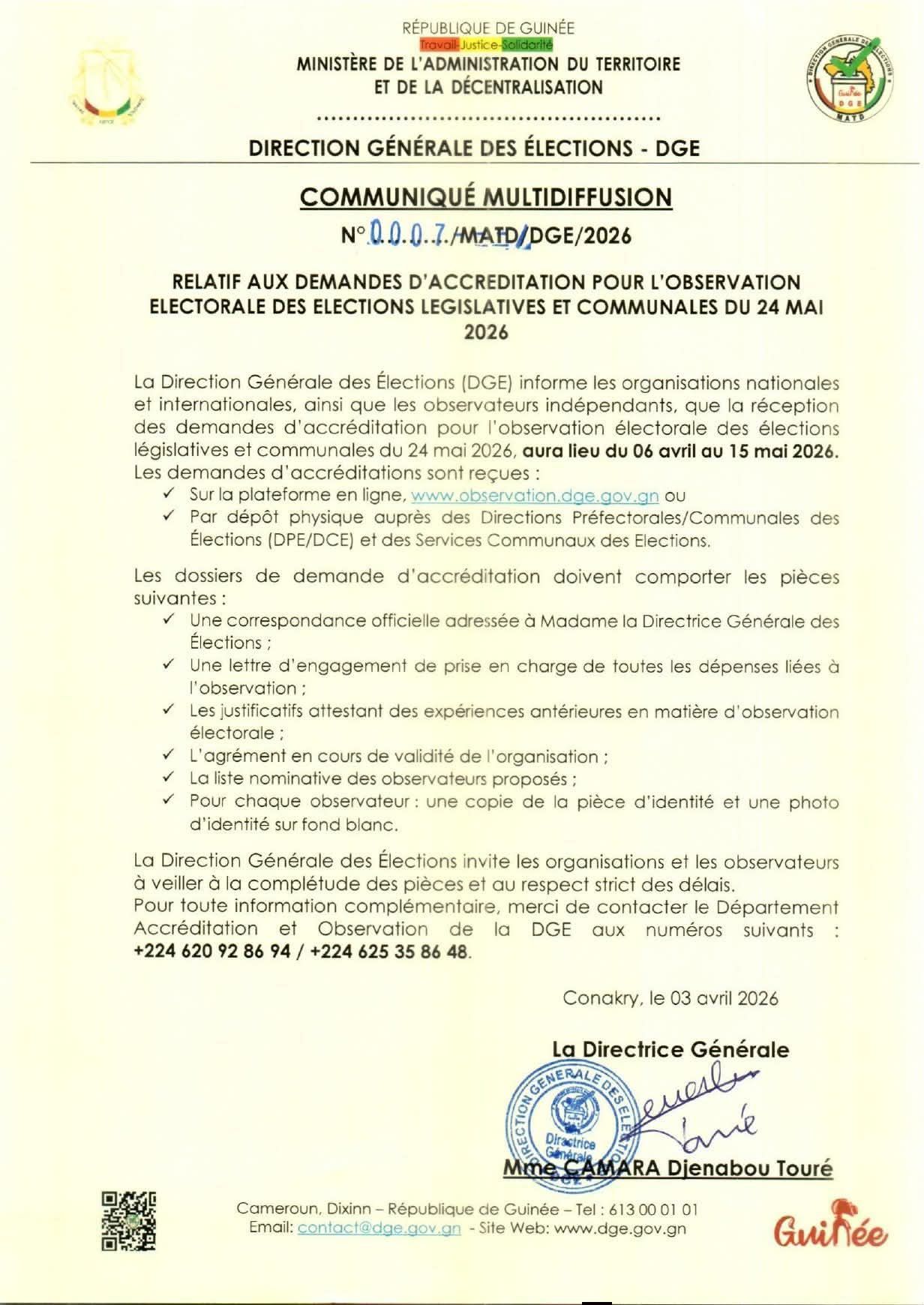 Conakry, 06 avril (AGP)-La Direction Générale des Elections (DGE) informe les organisateurs nationales et internationales, ainsi que les observateurs indépendants, que la réception des démandes d’accrédidations aura lieu du 06 avril au 15 mai 2026.
