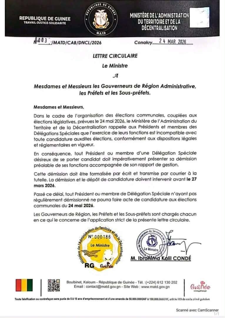 Conakry, 24 (AGP)-En prélude aux élections communales couplées aux législatives prévues le 24 mai 2026, le Ministère de l’Administration du Territoire et de la Décentralisation a adressé ce lundi 24 mars 2026, une lettre aux gouverneurs de régions, préfets et sous-préfets pour rappeler que les fonctions de président ou membre de délégation spéciale sont incompatibles avec toute candidature à ces élections, conformément aux textes en vigueur.