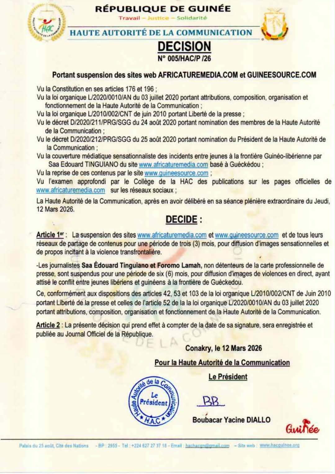 Conakry, 12 mars (AGP)-A travers un communiqué, la Haute Autorité de la Communication (HAC), a suspendu jeudi, 12 mars 2026 les sites www.africaturemedia.com et www.quineesource.com et « de tous leurs réseaux de partage de contenus pour une période de trois (3) mois, pour diffusion d’images sensationnelles et de propos incitant à la violence transfrontalière. »