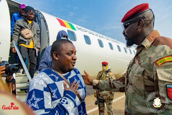 Conakry, 08 avril (AGP)-Le Président de la Transition, le Colonel Mamadi Doumbouya, en compagnie du ministre des Affaires Étrangères, de l’Intégration africaine et des Guinéens établis à l’Étranger, le Dr. Morissanda Kouyaté, a accueilli ce vendredi 7 avril 2023 nos compatriotes résidant en Tunisie. Un retour au compte du huitième convoi, composé de 46 personnes dont 3 femmes et 7 mineurs, à l’aéroport international Ahmed Sékou Touré.