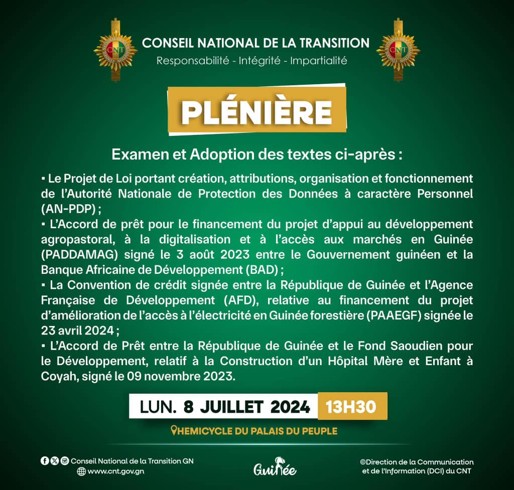 Conakry, 08 juil (AGP)-Dans un communiqué, le président du Conseil National de la Transition (CNT), Dr. Dansa Kourouma convie les conseillers nationaux à une plénière prévue ce lundi, 08 juillet 2024 à Conakry.