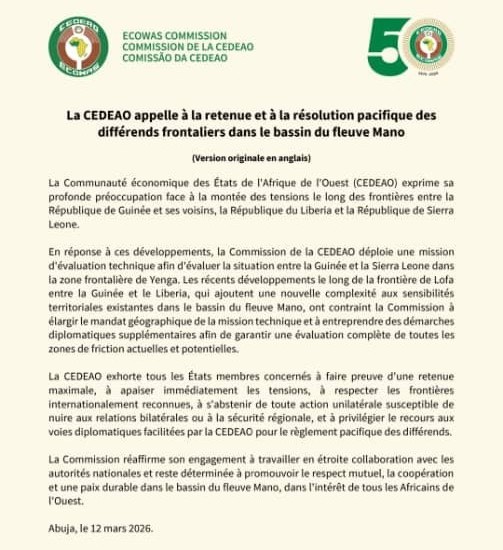 Conakry, 13 mars (AGP)-Dans un communiqué rendu public le jeudi, 12 mars 2026, la Communauté Economique des Etats de l’Afrique de l’Ouest (CEDEAO) fait part de son inquiétude face aux incidents rapportés dans certaines zones du bassin du fleuve Mano.