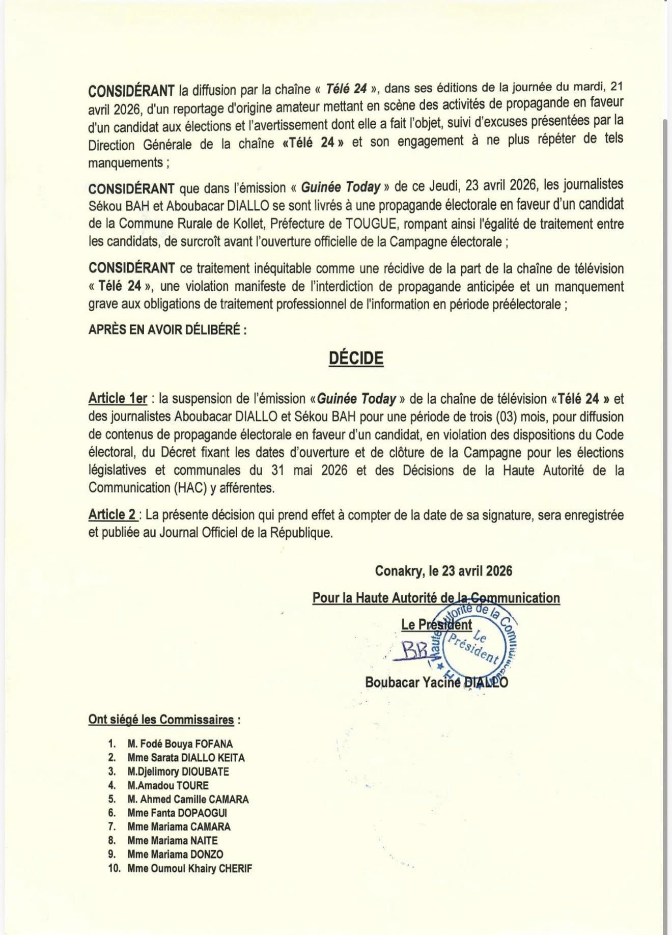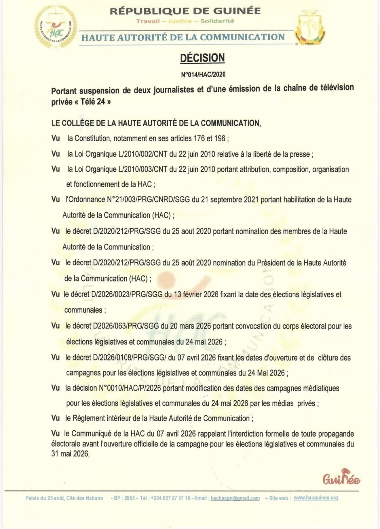 Conakry, 23 avril (AGP)-A travers un communiqué, la Haute Autorité de la Communication (HAC) a annoncé ce jeudi, 23 avril 2026, la suspension de l’émission « Guinée Today », diffusée sur la chaîne de télévision « Télé 24 », pour une durée de trois (03) mois.