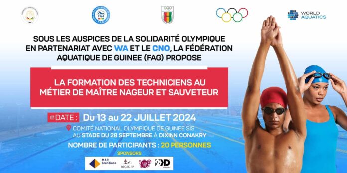 Conakry, 30 juin (AGP)- Dans le souci d’améliorer la compétence de ses membres, la Fédération Aquatique de Guinée (FAG), entend organiser du 13 au 22 juillet 2024 à Conakry, une formation pour les techniciens au métier de maître-nageur et sauveteur.