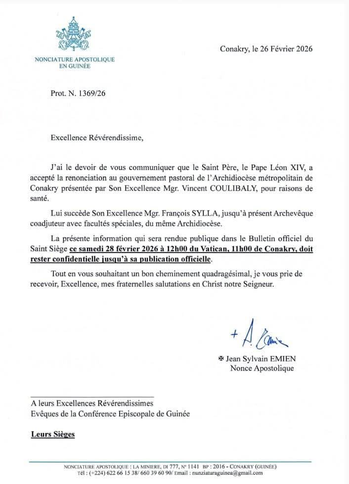 C’est dans le cadre solennel d’une récollection regroupant prêtres, religieux et religieuses que le représentant du Pape Léon XIV en Guinée et au Mali a libéré l’information. Le Nonce Apostolique a transmis la décision du Saint-Siège, précisant que ce changement à la tête de la province ecclésiastique de Conakry prend effet immédiatement.
