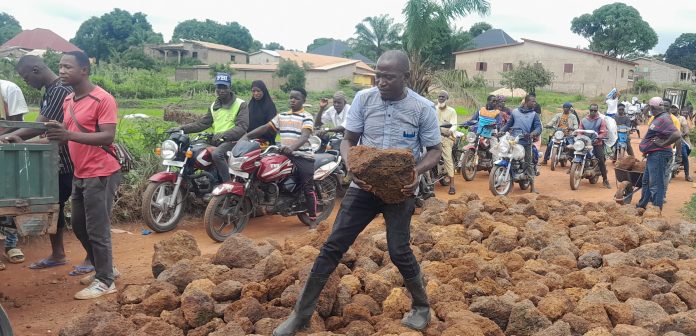 Les deux ponts concernés sont aujourd’hui dans un état critique, presque entièrement affaissés, rendant la circulation extrêmement dangereuse, voire impossible lors de fortes pluies. Dans un élan de solidarité, les jeunes, munis d’outils de terrassement, s’activent à combler les trous et à consolider la chaussée. Les travaux sont réalisés avec des moyens limités : des cailloux, extraits d’une carrière située à 15 kilomètres, sont transportés et utilisés grâce aux contributions volontaires des habitants.