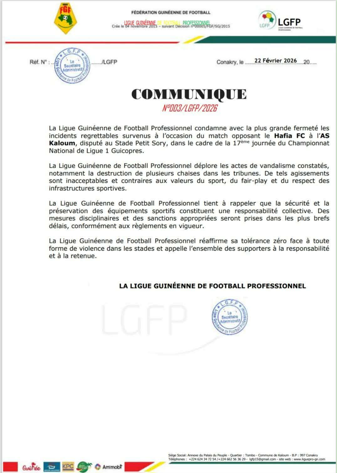 Conakry, 26 fév (AGP)- La Commission de Discipline de la Ligue Guinéenne de Football Professionnel (LGFP) a infligé des sanctions contre l’AS Kaloum suite aux incidents survenus lors de la 17ème journée de Ligue 1 Guicopres, le weekend dernier, au stade Petit Sory de Nongo. Des sanctions allant des matchs à huis-clos à domicile, une amende et un remboursement intégral des dommages matériels causés sur la pelouse du Hafia FC.