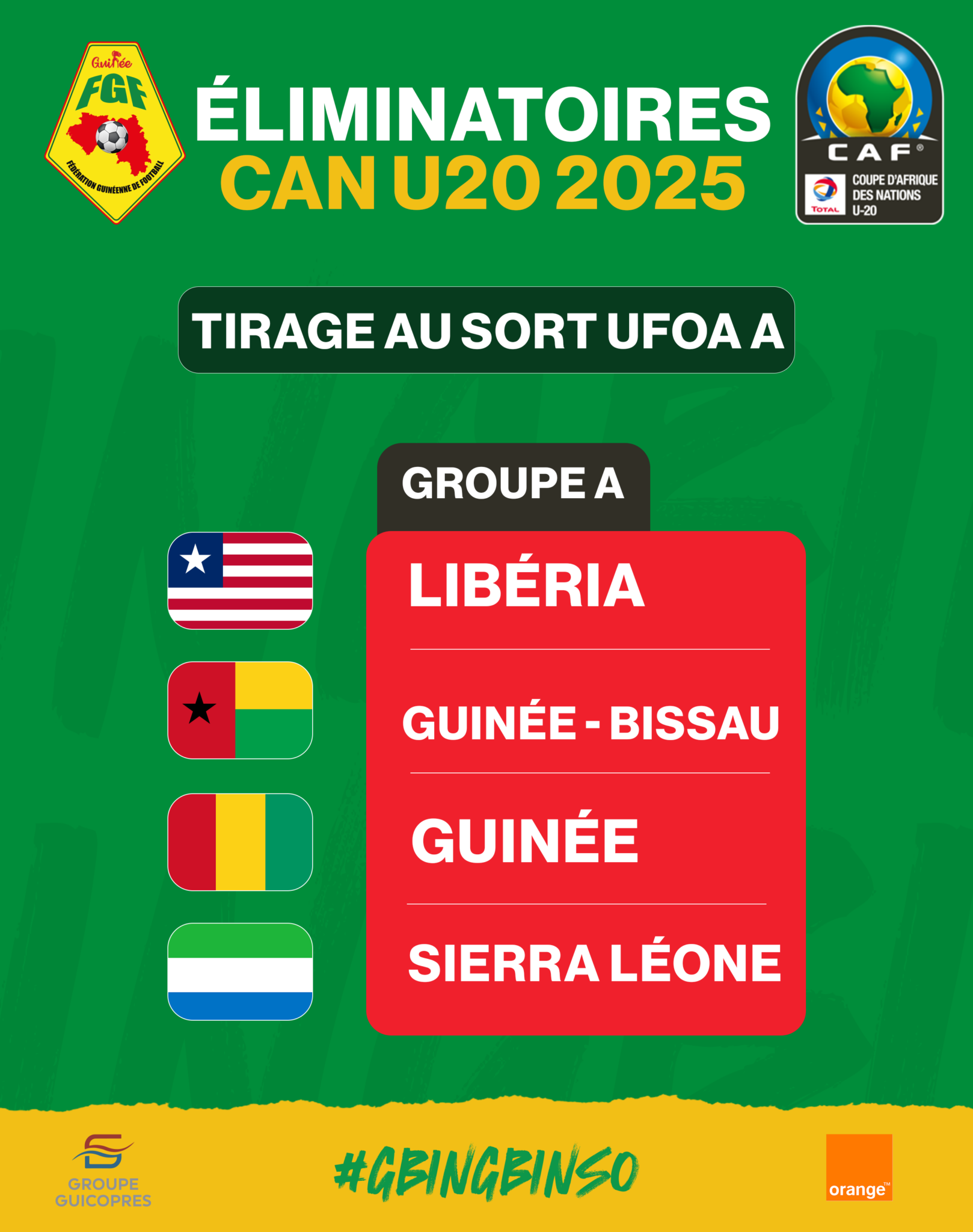 La course à la qualification pour la prochaine Coupe d’Afrique des Nations TotalEnergies des moins de 20 ans débutera dans les prochaines semaines à travers des tournois dans les différentes zones de la CAF. Au terme du tirage au sort qui a eu lieu ce vendredi 02 août 2024, la Guinée, en lice pour ces éliminatoires, est logée dans le groupe A en compagnie du Libéria, de la Guinée-Bissau et de la Sierra Léone.